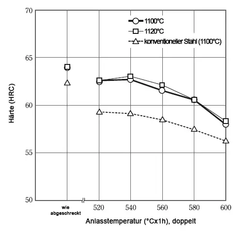 | konventioneller Stahl | 1.140°C, ölgehärtet | 540 - 600°C, zweifach angelassen |
